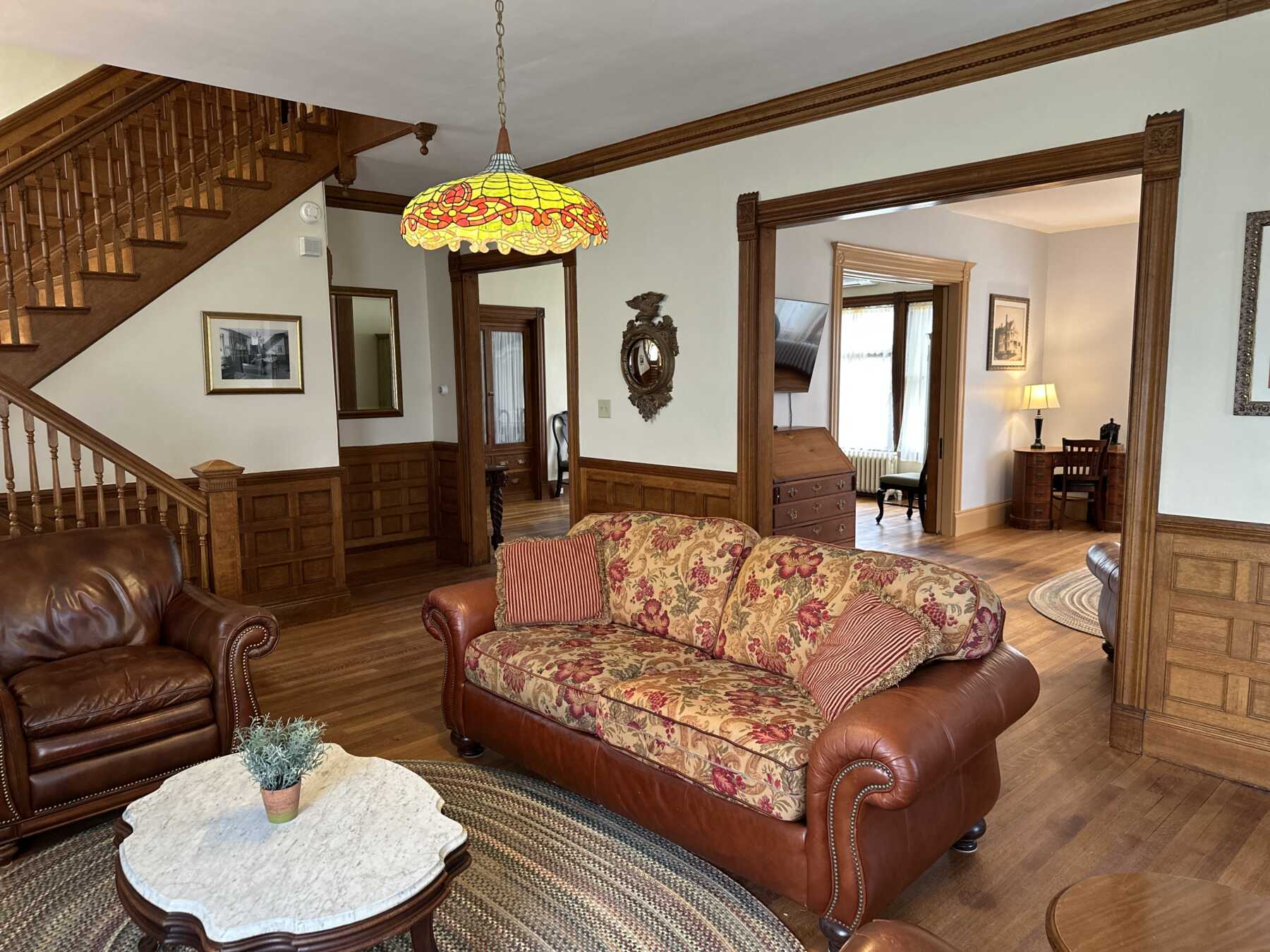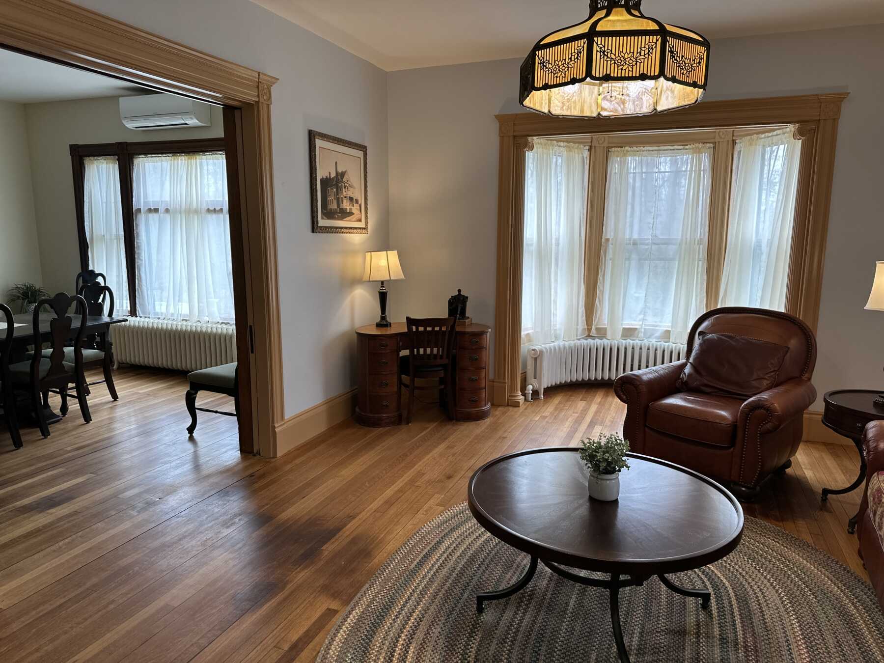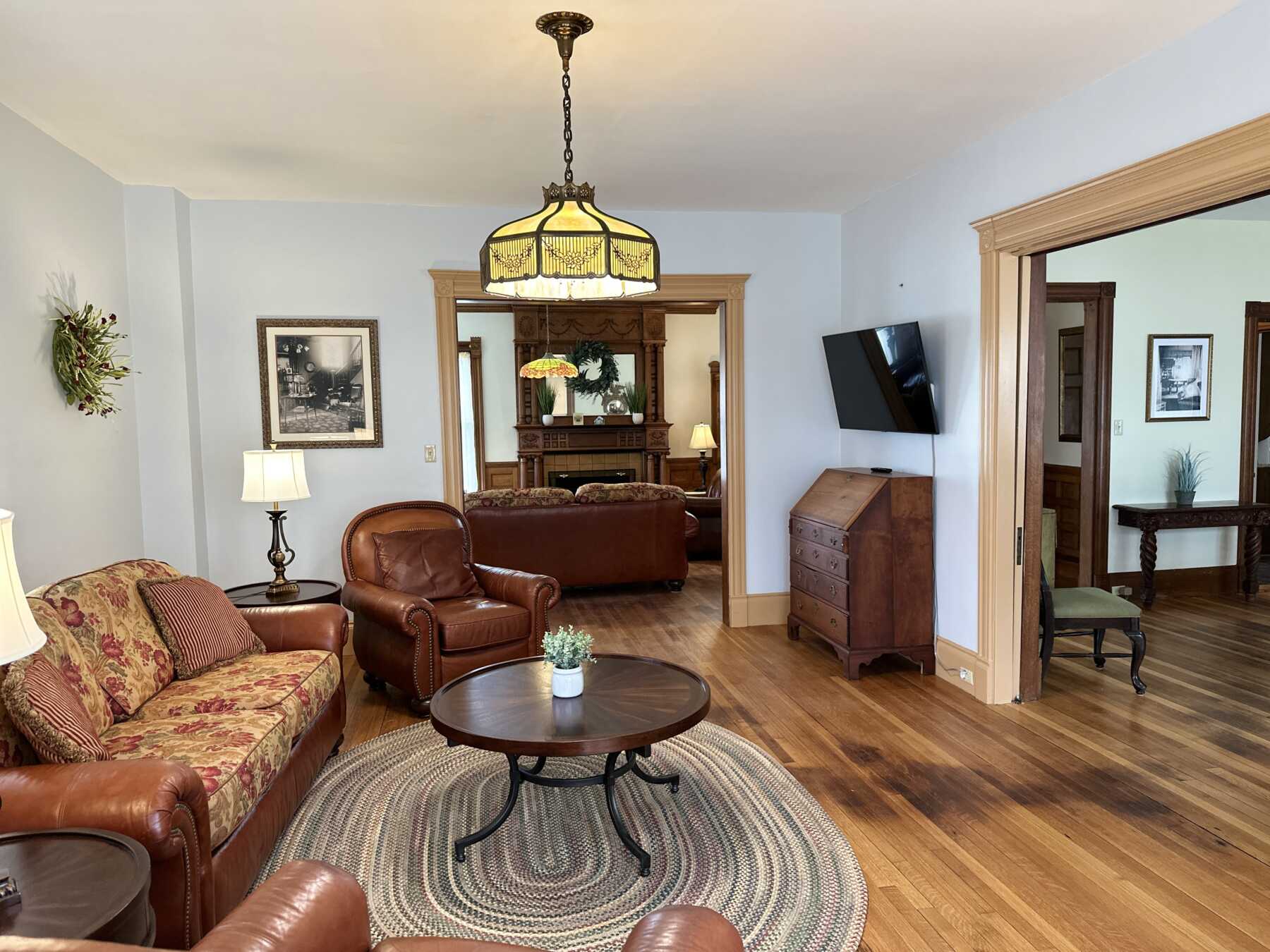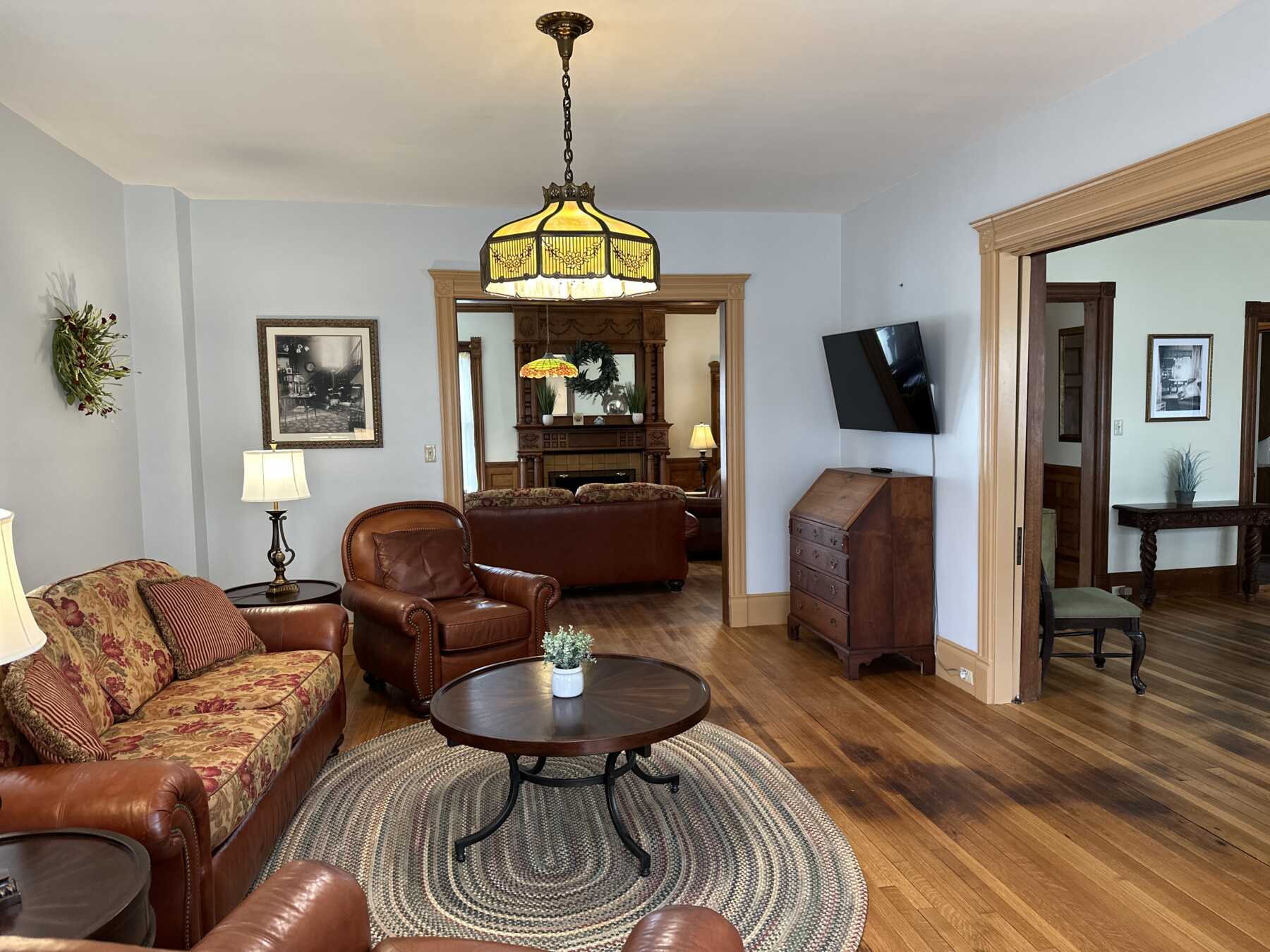 The first floor has huge porch over looking the grounds. 2 living rooms, formal dining room, library with sofa bed, full kitchen and 1/2 bath.